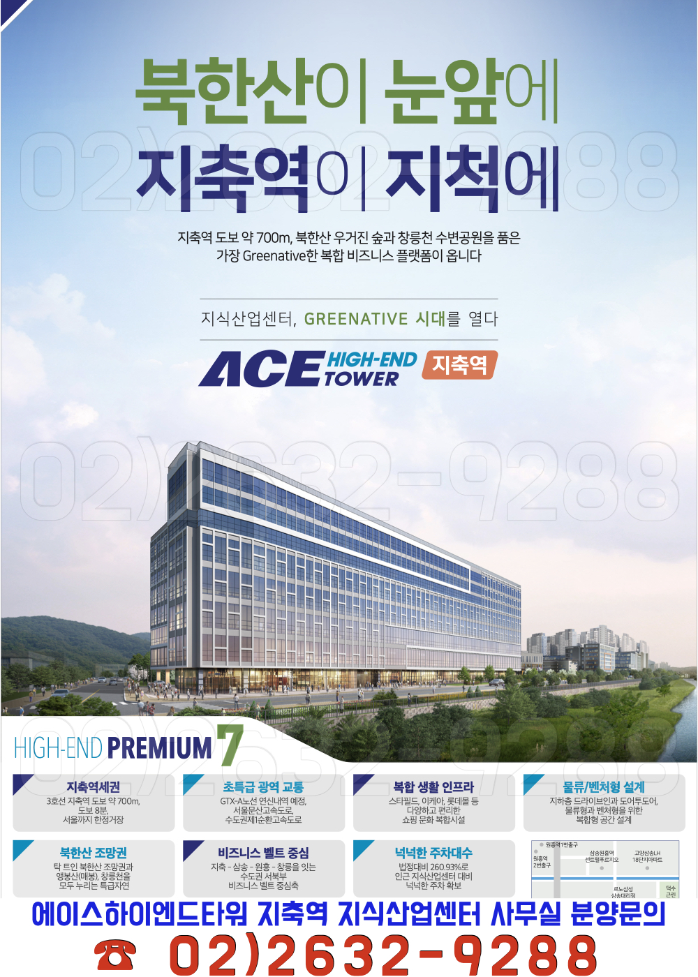 전면 창릉천 후면 앵봉산이 위치해 있고 북한산이 한눈에 보이는 입지위치 지식산업센터 에이스하이엔드타워 지축역